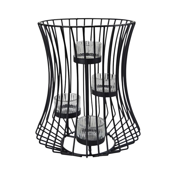 Add a stylish glow to your home with this Cage Four Tealight Holder. Measuring 20 ×24 cm, it features a sleek black metal wire cage with a gently curved silhouette. Inside, four clear glass tealight holders are positioned at varying heights, creating depth and visual interest. When lit, the open frame work allows candlelight to shine softly.
