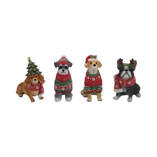 Celebrate Christmas with this charming assortment Christmas dog figurines, each dressed in festive winter attire. Featuring four adorable dogs wearing cosy Christmas sweaters and playful accessories—including Santa hats, a Christmas tree hat, and reindeer antlers—this assortment brings warmth, personality, and seasonal cheer to any space.