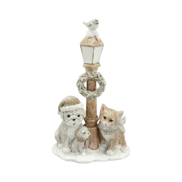 A charming winter figurine featuring an adorable dog and cat duo gathered beneath a traditional street lamp. Finished in soft neutral tones, the scene shows the dog wearing a cosy winter hat alongside a smaller pup, while the cat sits nearby wrapped in a knitted-style scarf. The lamp post is decorated with a festive wreath and topped with a delicate bird dusted in snow, completing the enchanting seasonal look. Set on a snowy base with subtle glitter accents, this heart-warming decoration is perfect for shelves, mantelpieces, or festive displays, adding a cosy and nostalgic touch to your Christmas décor.