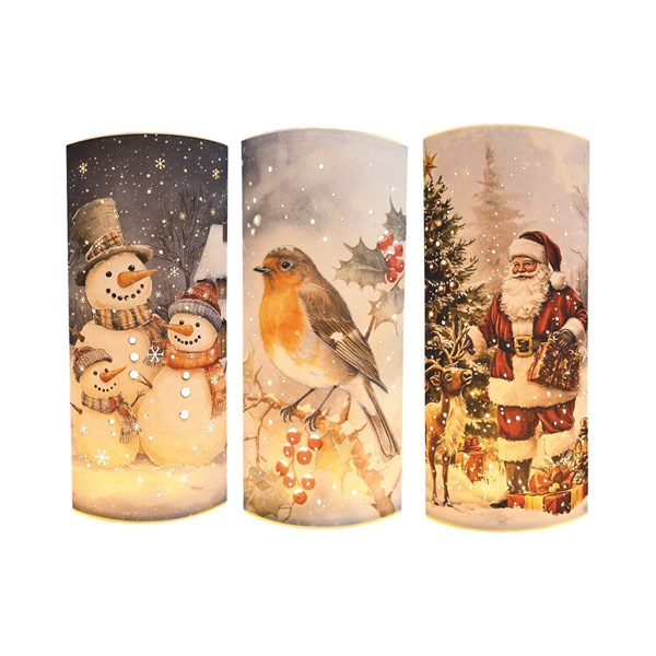 Three assorted glow lanterns featuring beautifully illustrated festive scenes. Each cylindrical paper lantern showcases a different design—cheerful snowmen, a winter robin, and Santa with a reindeer—enhanced by soft glowing light and delicate cut-out details that create a warm, cosy ambiance. Perfect for adding a touch of charm to Christmas décor.