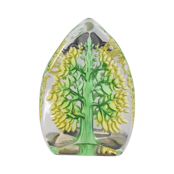 Golden Tree Paperweight 14cmBring natural beauty and artistic elegance to your desk with this 14cm Golden Tree Paperweight. Encased in a smooth, crystal-clear form, the paperweight features a vibrant green tree with cascading yellow foliage, creating a striking miniature sculpture that captures the warmth and serenity of nature.