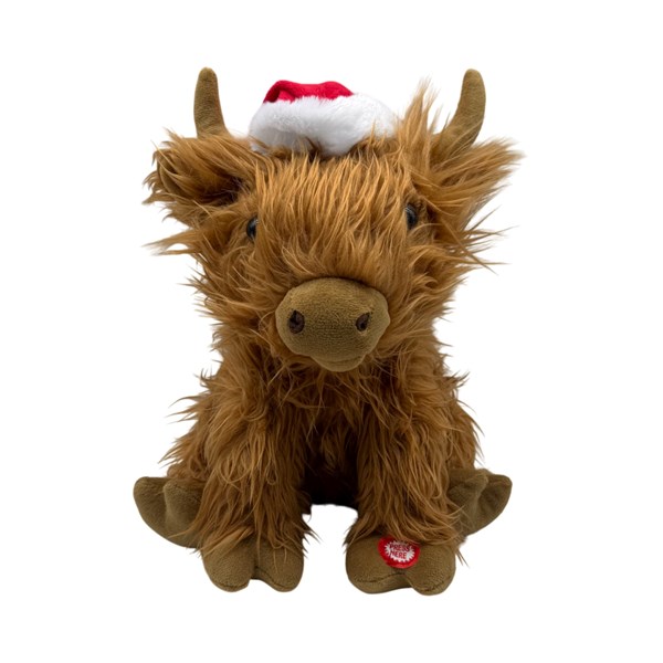 Bring festive fun and cosy charm to the season with this adorable Highland Cow “Let It Snow”. Standing 30 cm tall, this soft and cuddly plush feature a lovable Highland cow design with shaggy fur, soft horns, and a cute Santa hat for a seasonal touch. Finished with a playful “Let It Snow” theme and a press-activated feature, it’s perfect for Christmas gifting.
