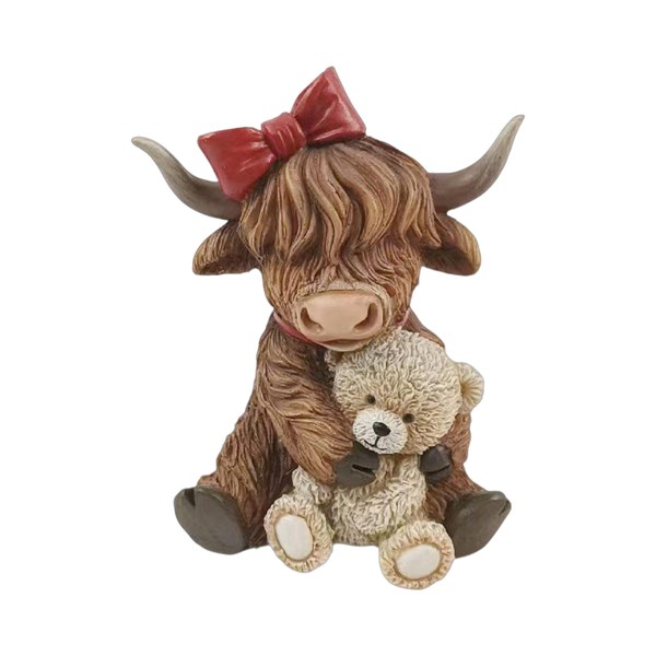 Add irresistible charm to your décor with this adorable figurine. The sweet ornament features a cute highland cow lovingly hugging a teddy bear. The highland cow is beautifully detailed with textured fur, soft brown tones and a large red bow that adds a playful touch.