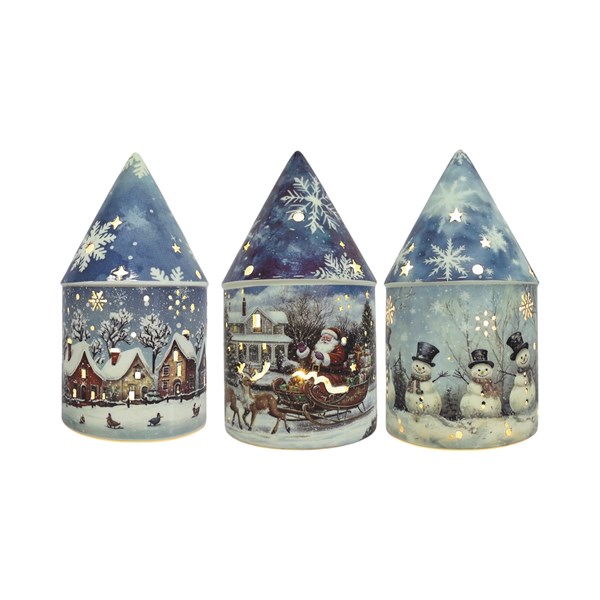 A set of three assorted LED ceramic house decorations featuring charming winter scenes. Each house showcases a different festive design, including a snowy village, Santa in his sleigh, and cheerful snowmen, all highlighted by warm LED light shining through delicate cut-out details. Finished with a classic house shape and wintery blue tones, these ceramic decorations are perfect for seasonal displays, adding a cosy and traditional touch to Christmas décor.