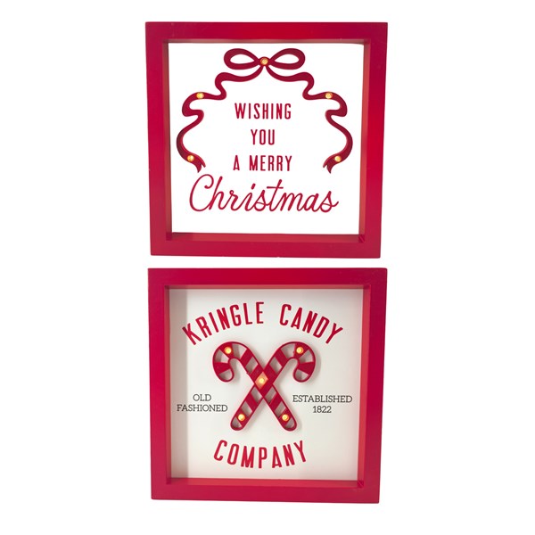 Add festive warmth and charm to your Christmas decoration with the LED Christmas Decoration. These square framed designs feature cheerful seasonal messages and candy-cane details, softly illuminated with warm LED lights for a cosy glow, they bring a classic Christmas feel to any space. Available in two assorted designs, they look wonderful displayed individually or paired together for a coordinated festive look.