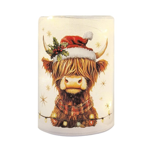 Add a warming glow to your Christmas décor, a glitter glass column Highland Cow wearing a Santa hat with a sprig of holly design. Within the column are glowing LED lights which will scatter through the glitter glass creating a stunning shimmering effect. This item is a delightful addition to any festive décor.