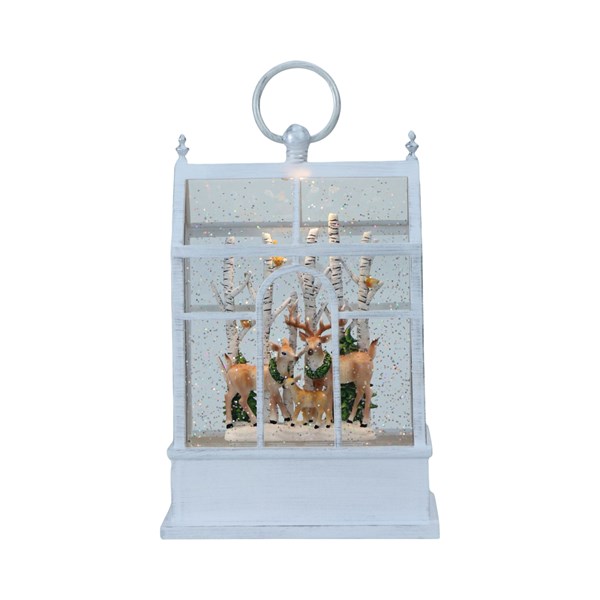 This charming white, windowed water spinner features graceful reindeer adorned with festive Christmas garlands, set against a backdrop of decorated trees and snowy branches. When activated, glitter swirls around the scene, creating a magical decoration perfect for adding festive cheer to any room.