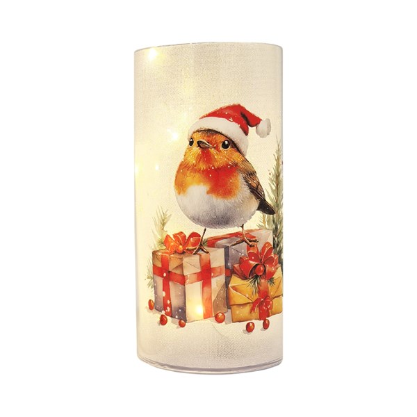 Add a warming glow to your Christmas décor with a glitter effect glass column with a festive robin and present design. Within the column are glowing LED lights which will scatter through the glitter glass creating a stunning shimmering effect. This item is a delightful addition to any festive décor.
