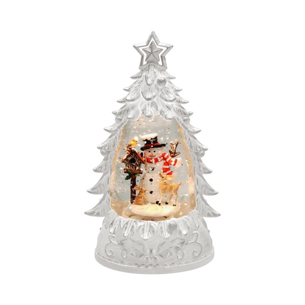 LED Snowman Tree Spinner 26cmBring festive warmth and charm into your home with this water glitter spinner. Designed in the shape of a classic Christmas tree in an icy silver, this decorative piece features a snowman family within. When switched on, LED lighting illuminates the interior while shimmering glitter continuously swirls, creating a magical spinning effect.Battery Operated – 3 x AA (not included) – can be purchased on code PM0001Can be used with a 4.5V 800MA adaptor (not included) can be purchased on code 25921