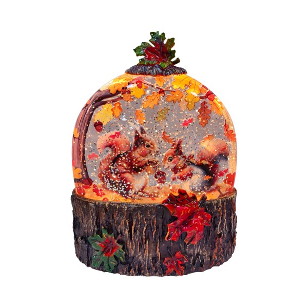 Bring cosy autumn charm to your décor with this delightful decorative piece that combines warm lighting, gentle motion and woodland whimsy. This beautifully detailed ornament features two playful squirrels nestled inside a clear dome, surrounded by fall leaves and acorns. When switched on, LED lights illuminate the globe, while glitter gently spins around, creating a magical effect.