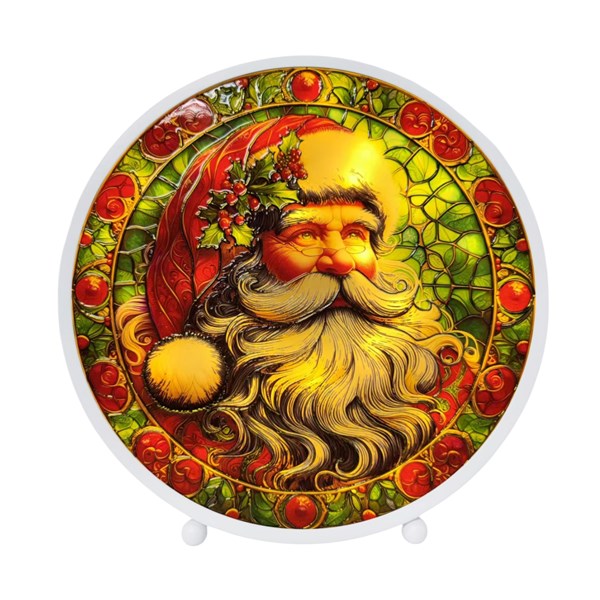 Add warmth and festive charm to your Christmas décor with this beautifully crafted LED decoration. Designed to mimic the rich glow of traditional stained glass, this illuminated piece features Santa Claus adorned with ornamental details. The LED lighting within bring the piece to life casting a soft, inviting radiance. The sturdy white frame and stand ensure easy placement and stability.
