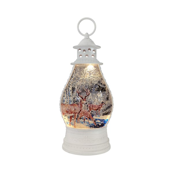 Styled as an elegant lantern-style ornament, this piece showcases a charming winter scene with reindeer in a snowy forest. When switched on, LED lights illuminate the piece, while glitter gently spins around, creating a magical effect.