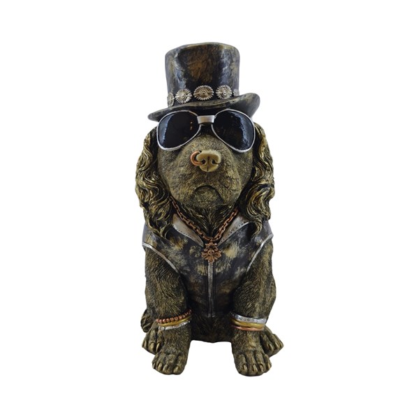 Rock star dog is a cool, edgy decorative figurine featuring a dog styled like a true rock icon. Wearing a top hat, sunglasses, zip-up vest, and bold accessories, this piece has a vintage bronze finish that adds attitude and character—perfect for music lovers and statement décor displays.
