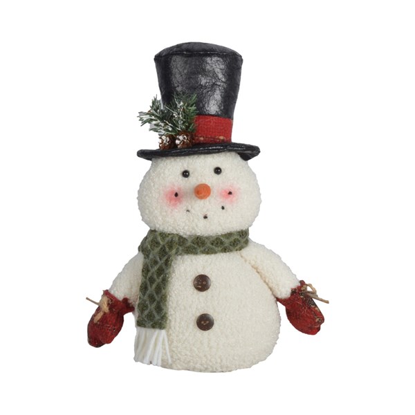 The snowman wears a tall black leather look top hat accented with a red band, pine greenery, and pinecones for a festive touch. A warm green scarf wraps around its neck, complemented by red mittens that complete the traditional winter style.